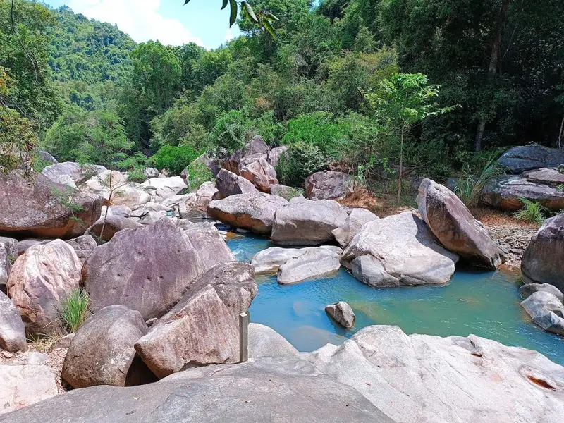 Dòng suối bắt nguồn từ đỉnh Hòn Son, len lỏi qua những phiến đá khổng lồ để tạo nên ba hồ nước riêng biệt. Càng lên cao, độ khó càng tăng nhưng cảnh sắc lại càng "siêu thực".