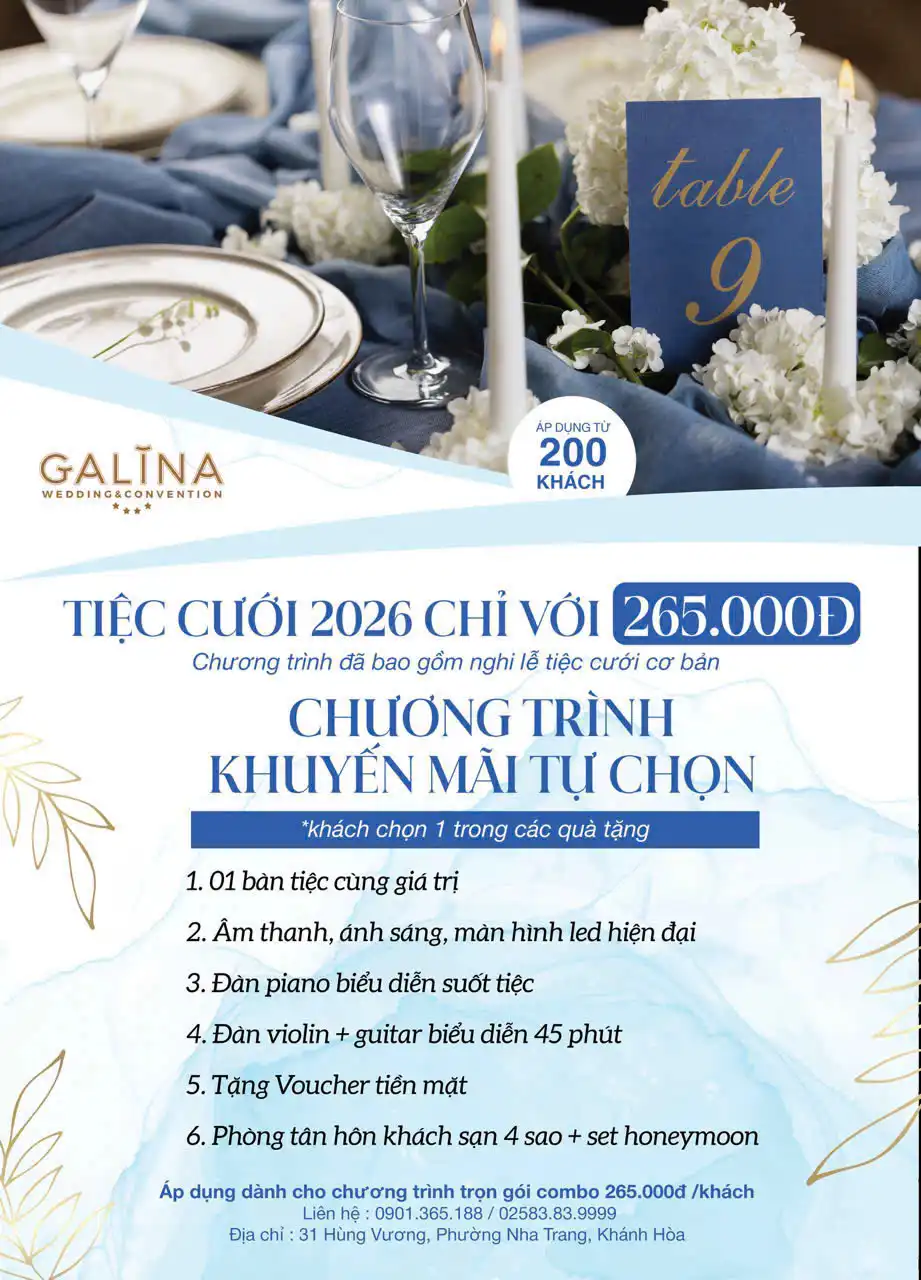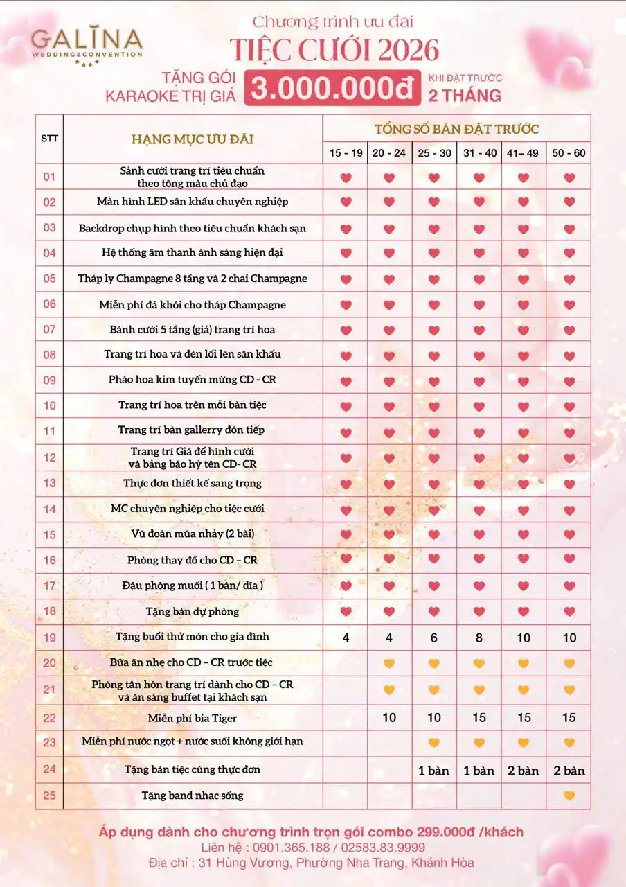 Tối đa hóa quà tặng: Tặng lên đến 5 bàn tiệc dự phòng, 10 buổi thử món cho gia đình và phòng tân hôn trang trí đẳng cấp.