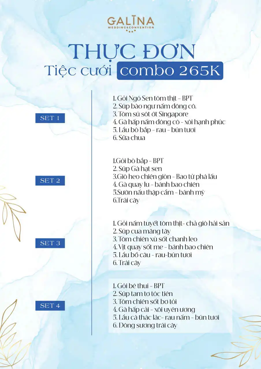 Một lựa chọn thông minh, cân bằng hoàn hảo giữa chi phí hợp lý và chất lượng dịch vụ chuẩn mực. Gói dịch vụ này mang đến cho bạn 4 sự lựa chọn thực đơn (Set 1 - Set 4) với 6 món ăn phong phú, kết hợp hài hòa giữa hương vị truyền thống và hiện đại.