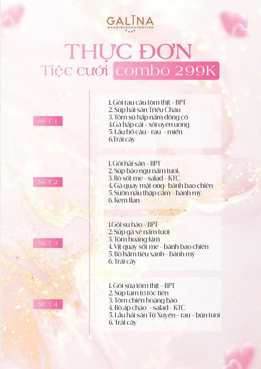 Được thiết kế để mang lại không gian tiệc cưới sôi động và đầy đủ tiện nghi hơn. Điểm nhấn của gói 299K là hệ thống thực đơn 6 món cao cấp cùng các dịch vụ giải trí được nâng cấp rõ rệt dựa trên số lượng bàn đặt trước.
