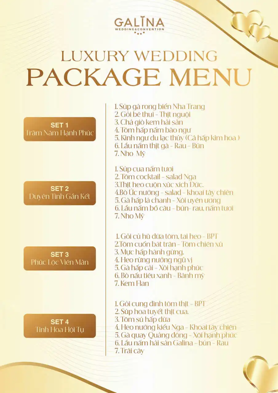 Dành cho những cặp đôi khao khát một lễ cưới xa hoa, đẳng cấp và không thể nào quên. Gói Luxury nâng tầm trải nghiệm ẩm thực với 4 thực đơn 7 món mang ý nghĩa cát tường: Trăm Năm Hạnh Phúc, Duyên Tình Gắn Kết, Phúc Lộc Viên Mãn, Tinh Hoa Hội Tụ.